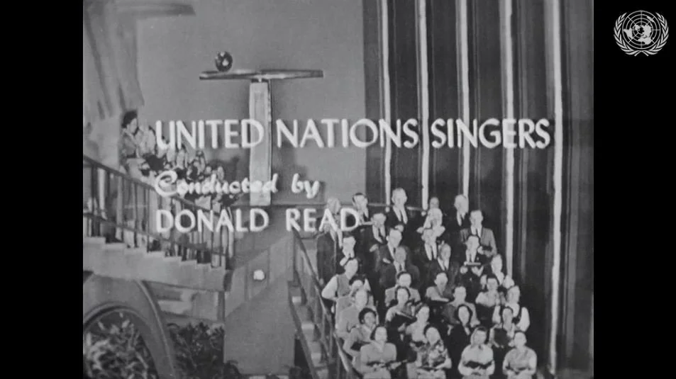 One of the UN Singers’ first recorded performance, from 1958 as part of the Dateline UN documentary series, presenting a Christmas show with the UN Singers, conducted by Donald Read and featuring distinguished guest artist Eleanor Steber. Watch the full video here.